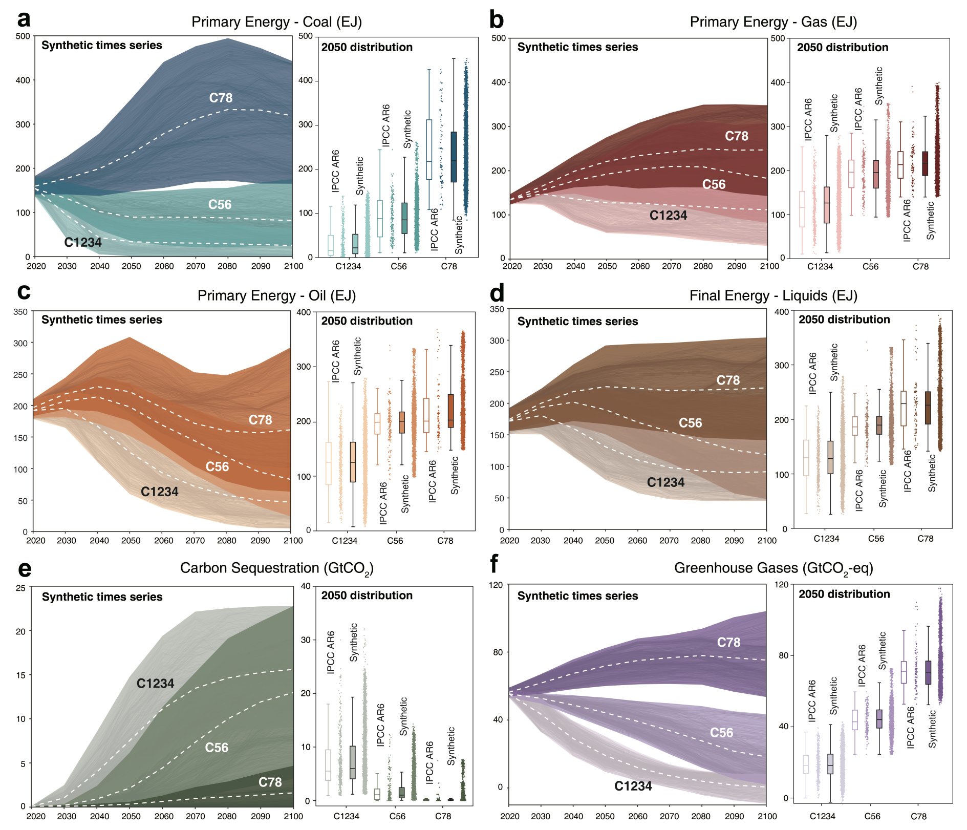 针对这一挑战,亚星游戏网偶阳研究员课题组联合国际机器学习研究中心周沛劼助理教授团队,在 Nature Climate Change 在线发表了题为《Using Deep Learning to Generate Key Variables in Global Mitigation Scenarios》的研究成果。团队以IPCC第六次评估报告(AR6)情景数据库的1202个减排情景为训练基础,利用变分自编码器(VAE)、生成对抗网络(GAN)等多种深度学习架构,成功生成了覆盖C1-C8八类气候减缓路径的3万条情景,涵盖主要能源结构与温室气体排放等关键变量。实验结果表明,该生成式框架不仅在效率上大幅超越了传统IAMs,实现了海量情景的快速构建,也为多维不确定性评估和政策敏感性分析提供了丰富且可操作的样本。